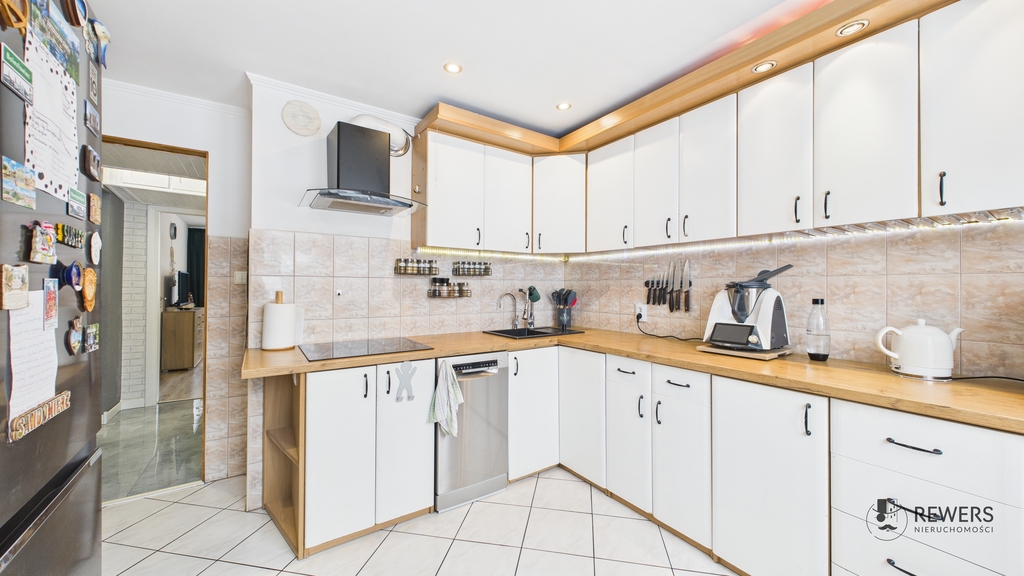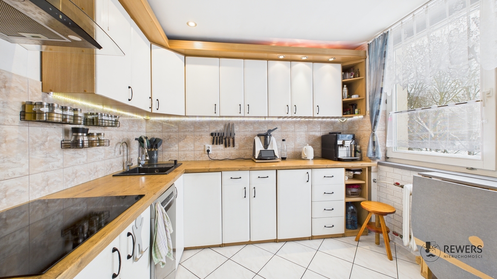 - oddzielna kuchnia: 3,25 × 2,80 m, zabudowa kuchenna z piekarnikiem, płytą elektryczną i okapem