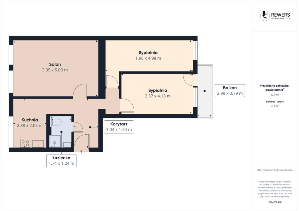 Powierzchnia mieszkania wynosi 53 m². Składa się ono z 3 oddzielnych pokoi, osobnej kuchni z dużym oknem oraz łazienki i przedpokoju.