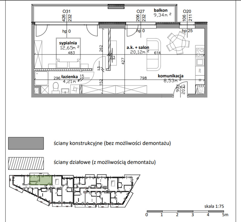 - Salon z aneksem kuchennym (20,12 m²) i wyjściem na balkon,