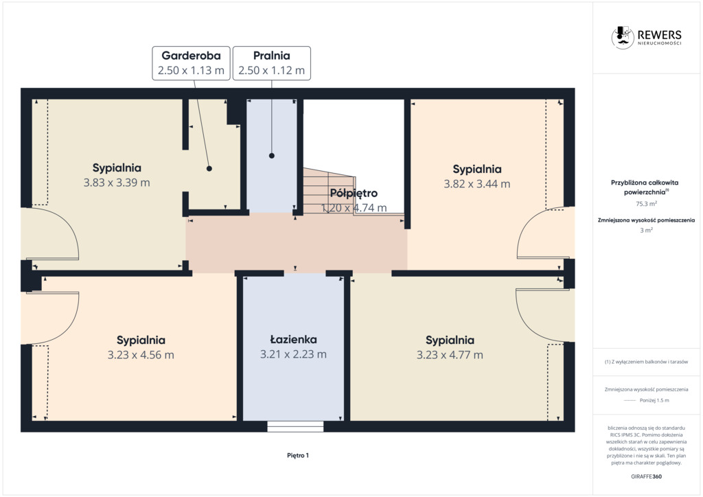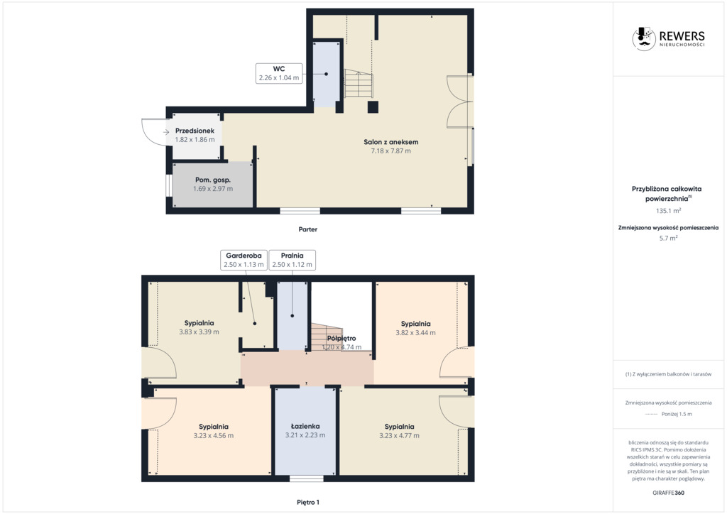 - Piętro: cztery oddzielne pokoje w tym jeden z garderobą, łazienka oraz pralnia.