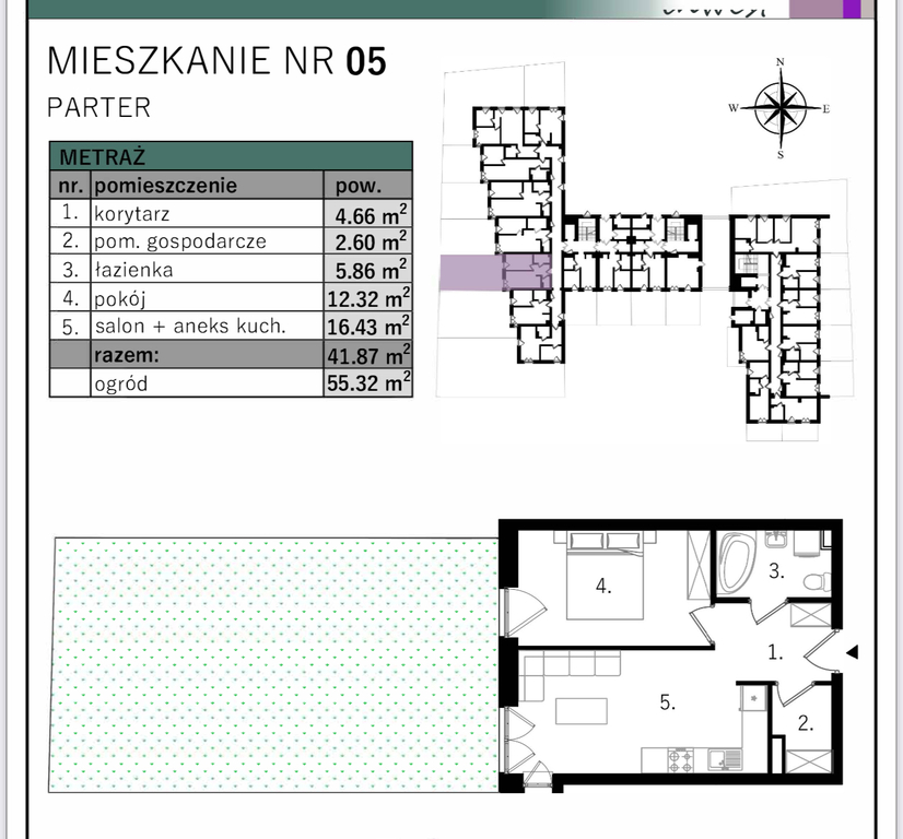 Opisane mieszkanie na parterze posiada ogród o powierzchni 55,32m2