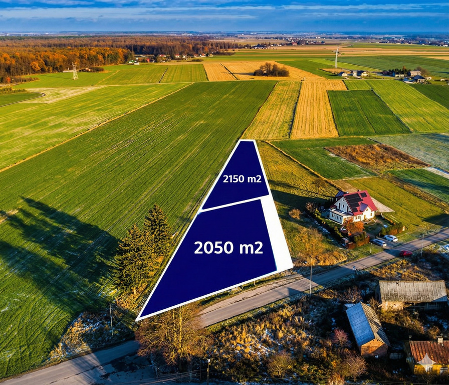 - Podział na dwie działki – koncepcja zakłada wydzielenie dwóch niezależnych parceli o powierzchni 2050 m² i 2150 m² wraz z komfortową drogą dojazdową do drugiej linii zabudowy.
