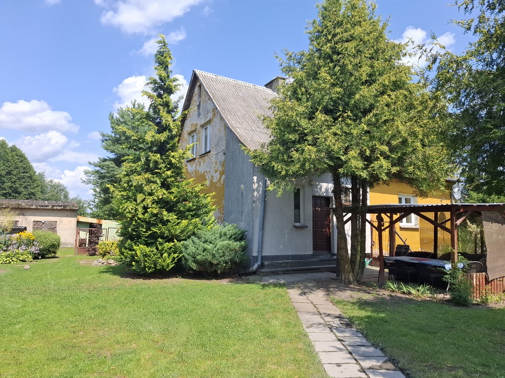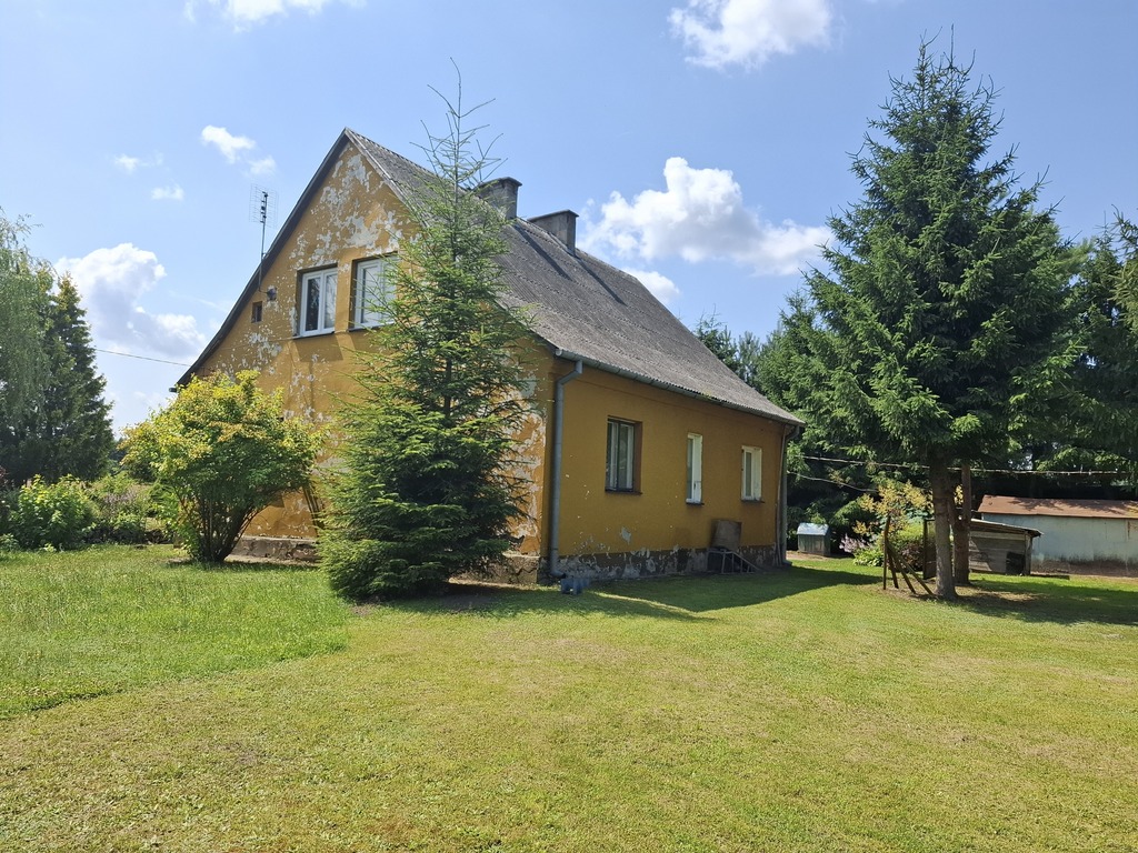 - Na działce znajdują się murowany budynek mieszkalny (114,46 m²) z użytkowym poddaszem i małą piwnicą, oraz budynek gospodarczy (26,8 m²). Budynki są około 70-letnie, w przeciętnym stanie technicznym, wymagają remontu (pokrycie dachu azbestem i papą). Istniejąca zabudowa daje solidną bazę do renowacji lub przebudowy. Masz dwie opcje: przeprowadzić gruntowny remont lub wyburzyć istniejące budynki i postawić nowoczesny dom od podstaw, idealnie dopasowany do Twoich potrzeb.