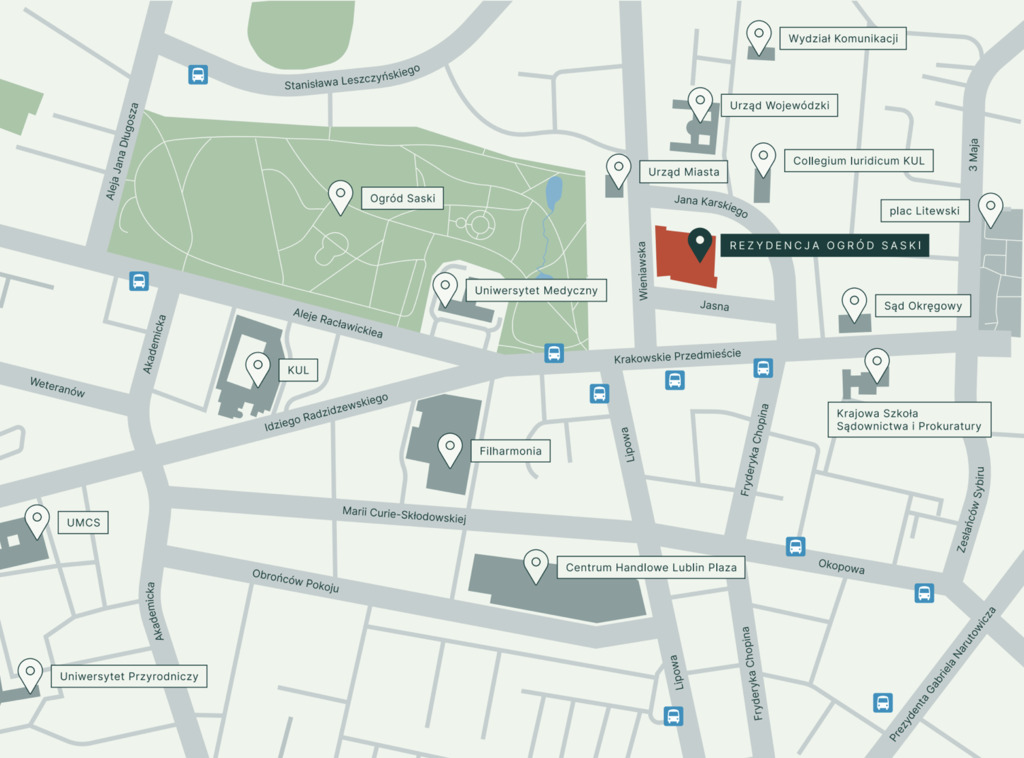 Okolica: Lokalizacja w centrum miasta zapewnia dogodny dostęp do wielu atrakcji oraz gwarantuje wysoki ruch turystyczny i pieszy. W sąsiedztwie znajdują się istotne instytucje, takie jak Urząd Miasta oraz Urząd Wojewódzki, a także renomowane uczelnie: Uniwersytet Medyczny, KUL, UMCS i Uniwersytet Przyrodniczy. W okolicy znajduje się również Centrum Handlowe Plaza, Ogród Saski oraz Filharmonia Lubelska, co podnosi prestiż tej lokalizacji. Dodatkowo, w okolicy są liczne przystanki komunikacji miejskiej oraz inne udogodnienia, co sprawia, że miejsce to jest niezwykle atrakcyjne dla różnorodnych form działalności.