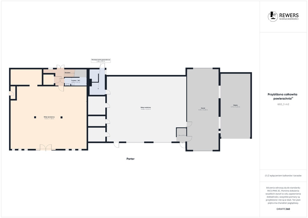 - Główna Sala Sprzedażowa – Sklep Metalowy (ok. 200m²): Otwarta przestrzeń z solidnymi regałami do wysokiego składowania ekspozycyjnymi na cięższy asortyment, przejrzysta ekspozycja narzędzi, artykułów hydraulicznych, elektrycznych i budowlanych. Sklep metalowy posiada także antresolę, która niemalże podwaja powierzchnię ekspozycyjną. Ta hali część jest również wyposażona w duże, automatyczne bramy wjazdowe, które pozwalają na wjazd nawet samochodom ciężarowym. Tak jak poprzednio bezpośrednio do sklepu przynależą pomieszczenia socjalnego (szatni, toalety, łazienki z prysznicem, aneksem kuchennym, biurem i magazynkiem.