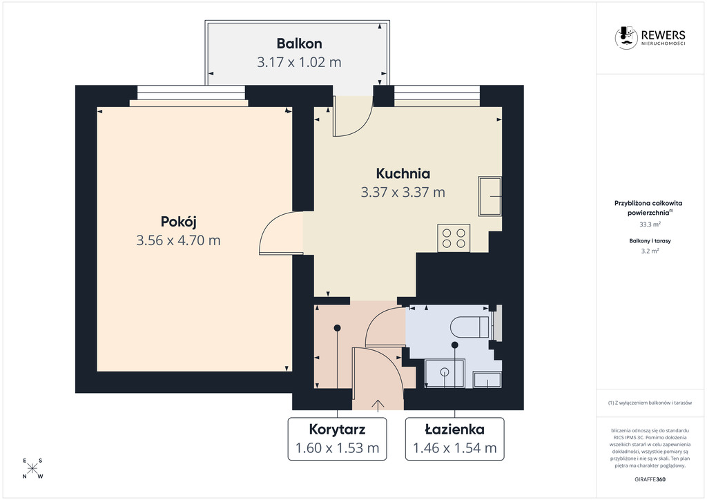 Kluczowe informacje- Metraż: 33,32 m² mieszkanie + balkon 3,2 m² + piwnica ok. 3 m²