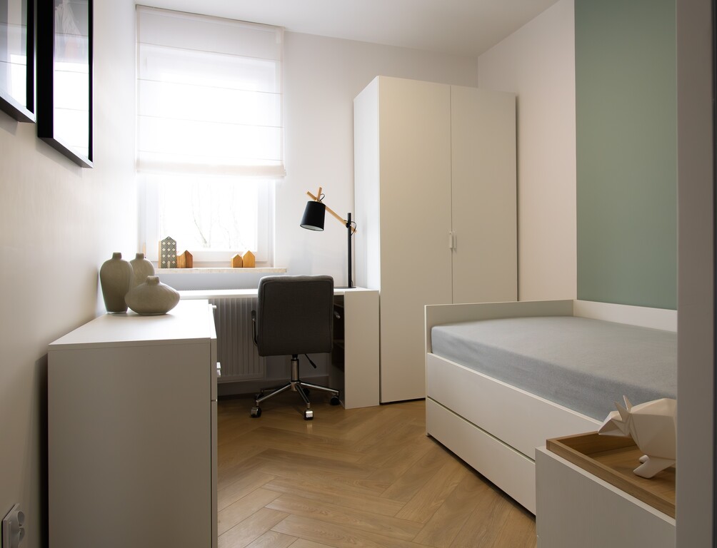 - Jasny pokój (8,03 m²): Idealny na pokój dziecięcy/gabinet, okno na południowy-zachód.