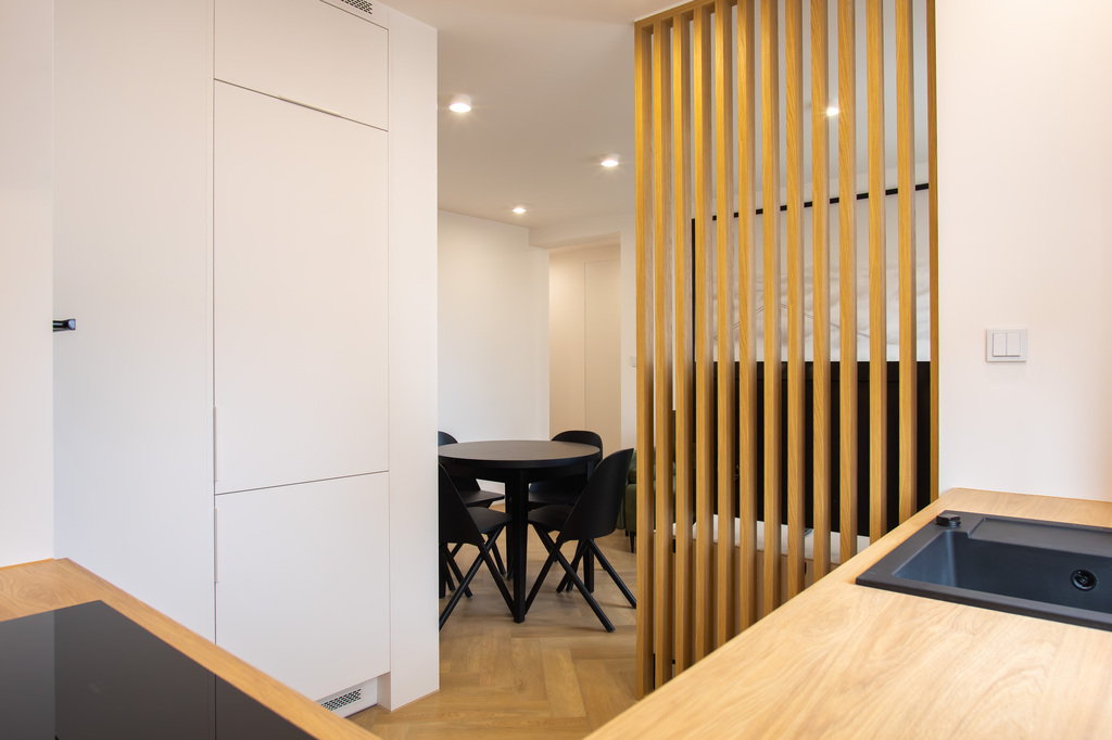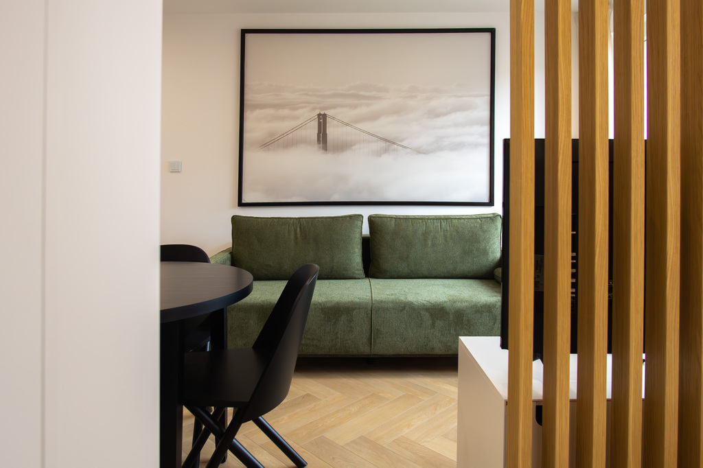 - Podłoga: Nowe panele winylowe w ponadczasową jodełkę – nowoczesny i trwały wygląd.