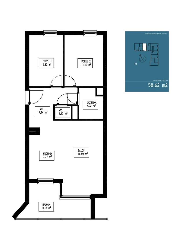 58,62 m² z balkonem, z komórką lokatorską