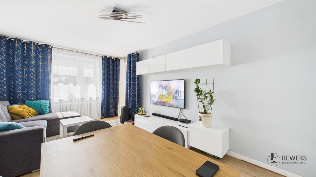 Mieszkanie ma powierzchnię 68,6 m². Składa się z 3 oddzielnych pokoi, dużej i w pełni wyposażonej kuchni (lodówka, piekarnik, kuchenka gazowa, zmywarka, okap), łazienki z wanną, osobnego WC oraz balkonu.