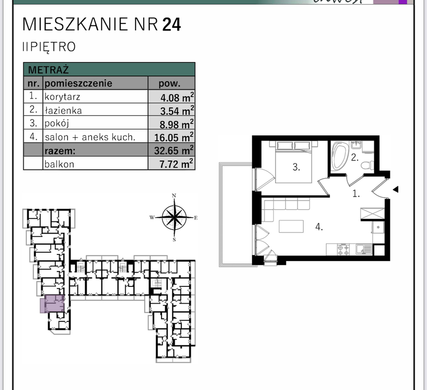 Opisane mieszkanie na II piętrze posiada balkon o powierzchni 7,72m2