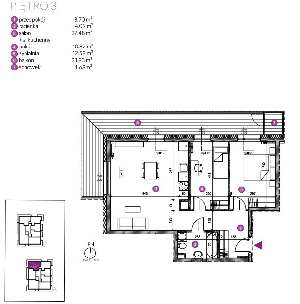 Do mieszkania przynależy balkon 23,93m2 oraz schowek o powierzchni 1,68m2