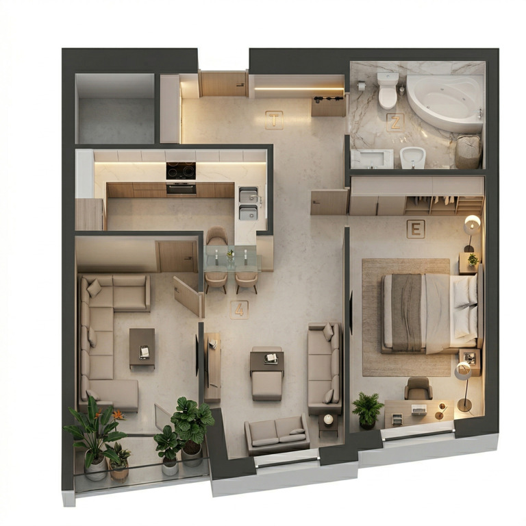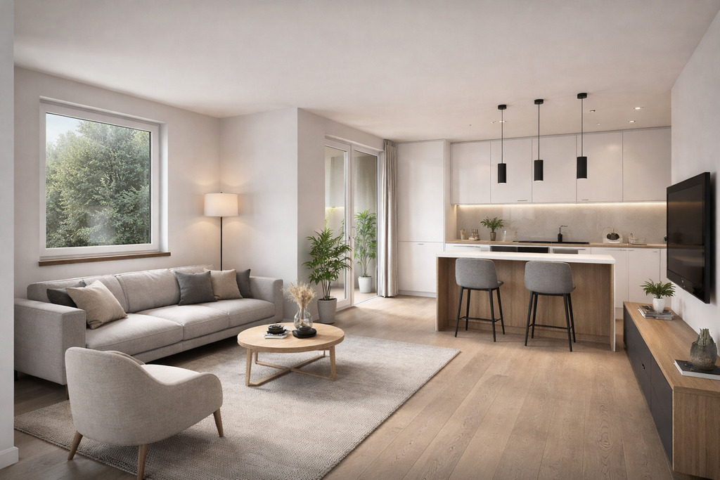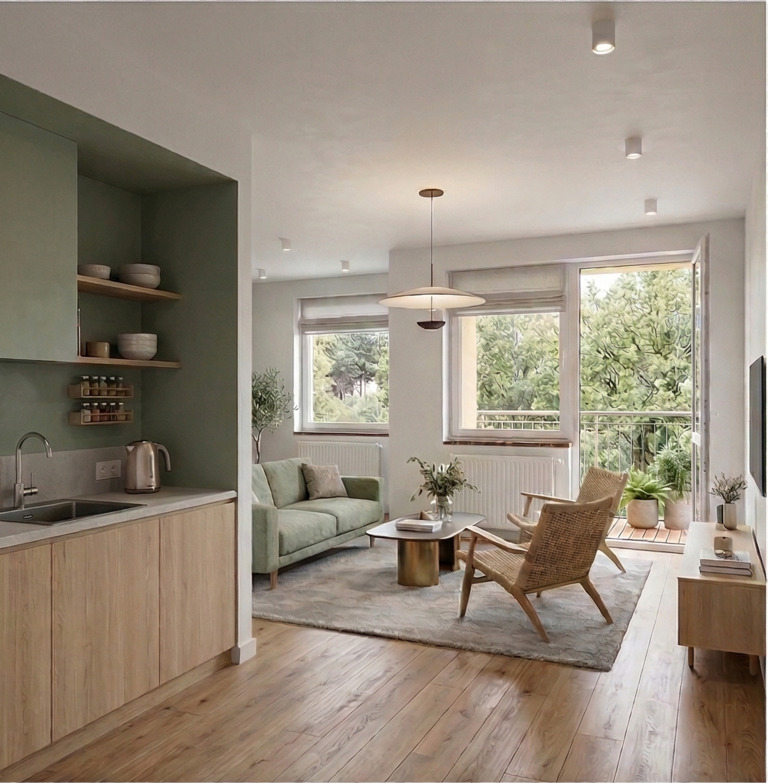 - Salon z aneksem kuchennym(27 m²): Twoje centrum dowodzenia z bezpośrednim wyjściem na słoneczny balkon.