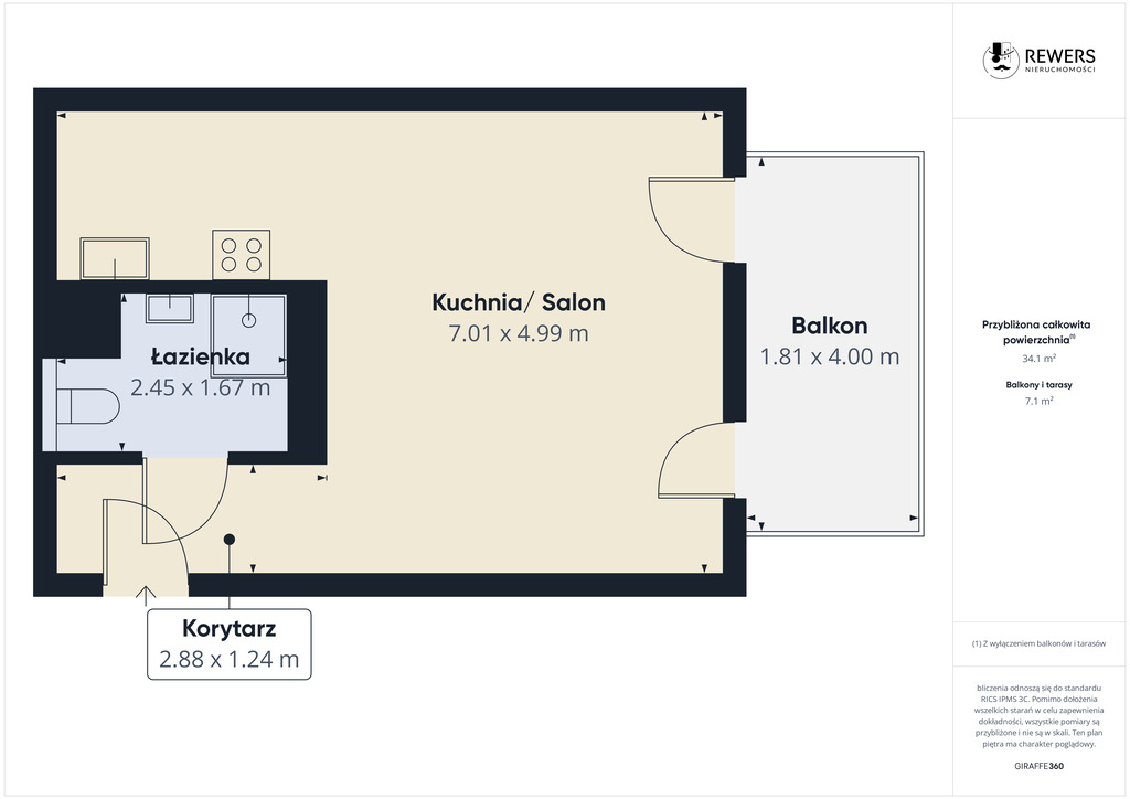 Na powierzchnię 34,7 m² składają się:- przestronny salon o pow. 22,7 m2