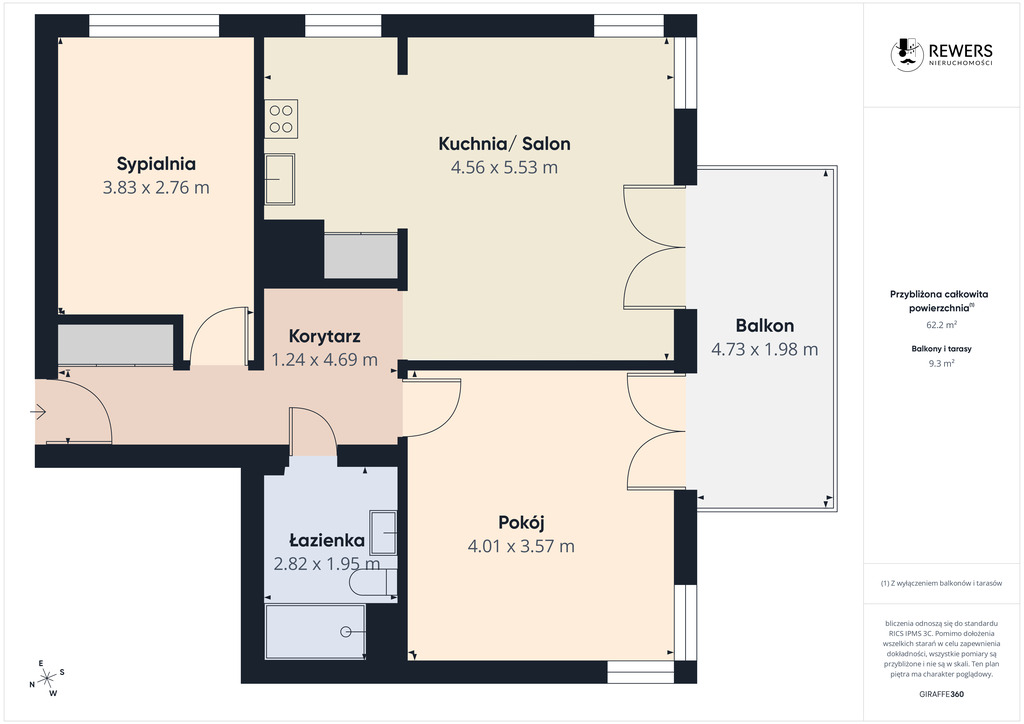 POWIERZCHNIA I ROZKŁAD (60,66 m²): Mieszkanie 3-pokojowe, funkcjonalny układ: